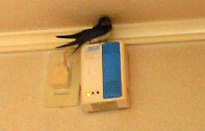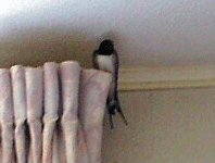 ツバメ・・・!?カーテンのレールの上に何故かツバメがこんにちは。・・しかも2羽も。